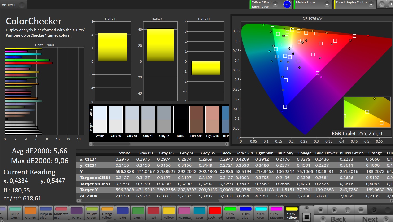 | Colorchecker dE 2000 max. * | 9.06 | 3.7 59% | 2.47 73% | 8.37 8% | 3.3 64% |