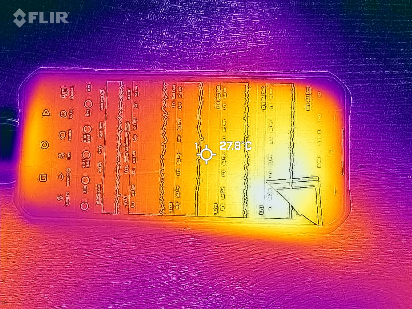 (+) La temperatura máxima en la parte superior es de 34.3 °C / 94 F, frente a la media de 35.2 °C / 95 F, que oscila entre 21.9 y 247 °C para la clase Smartphone.