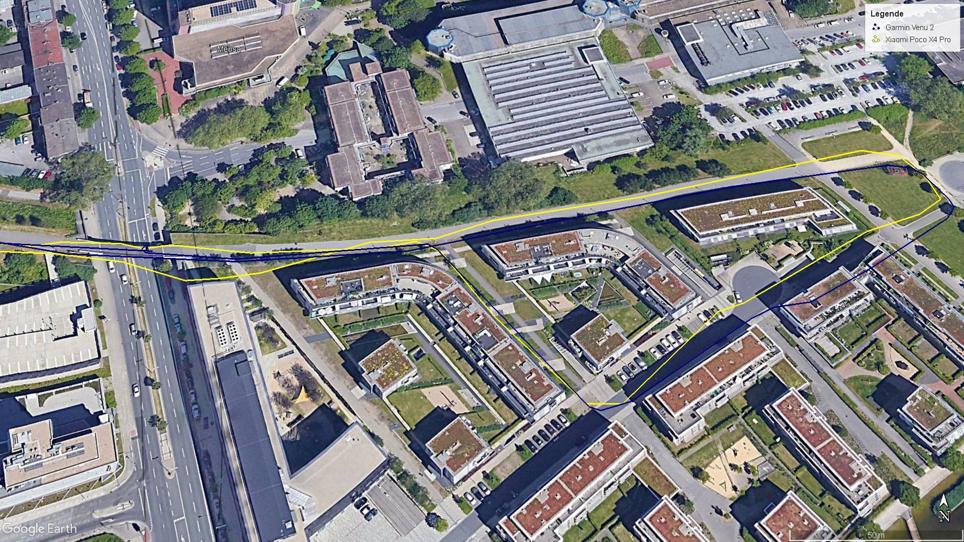 El Poco X4 Pro utiliza los principales sistemas de satélites GPS (L1), GLONASS (G1), BeiDou (B1) y Galileo (E1), así como SBAS para la localización. Para evaluar la precisión del seguimiento en la práctica, llevamos el teléfono de gama media a un viaje corto y grabamos la ruta junto con un Garmin Venu 2 para comparar.