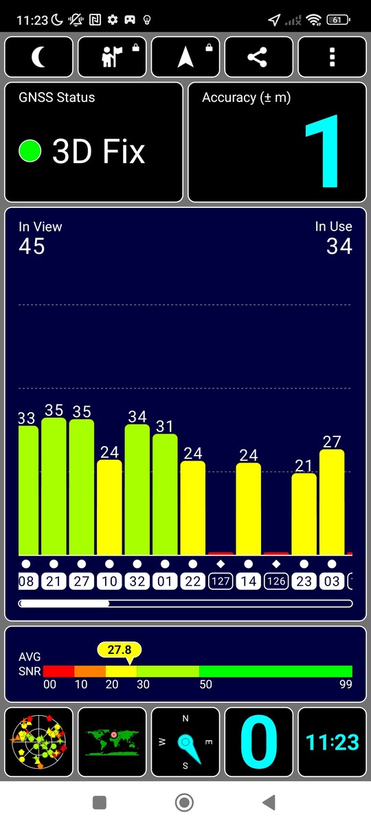 El smartphone Xiaomi determina su ubicación actual mediante los sistemas de navegación por satélite GPS (L1), Glonass (E1), Galileo (E1) y Beidou (B1). En nuestra prueba, lo consiguió no sólo con rapidez, sino también con mucha precisión. Con la aplicación GPS Test, el Redmi Note 11S logró una precisión de 2 metros (~6,6 pies) en interiores e incluso fue capaz de aumentarla a 1 metro (~3,3 pies) en exteriores.