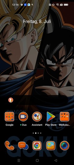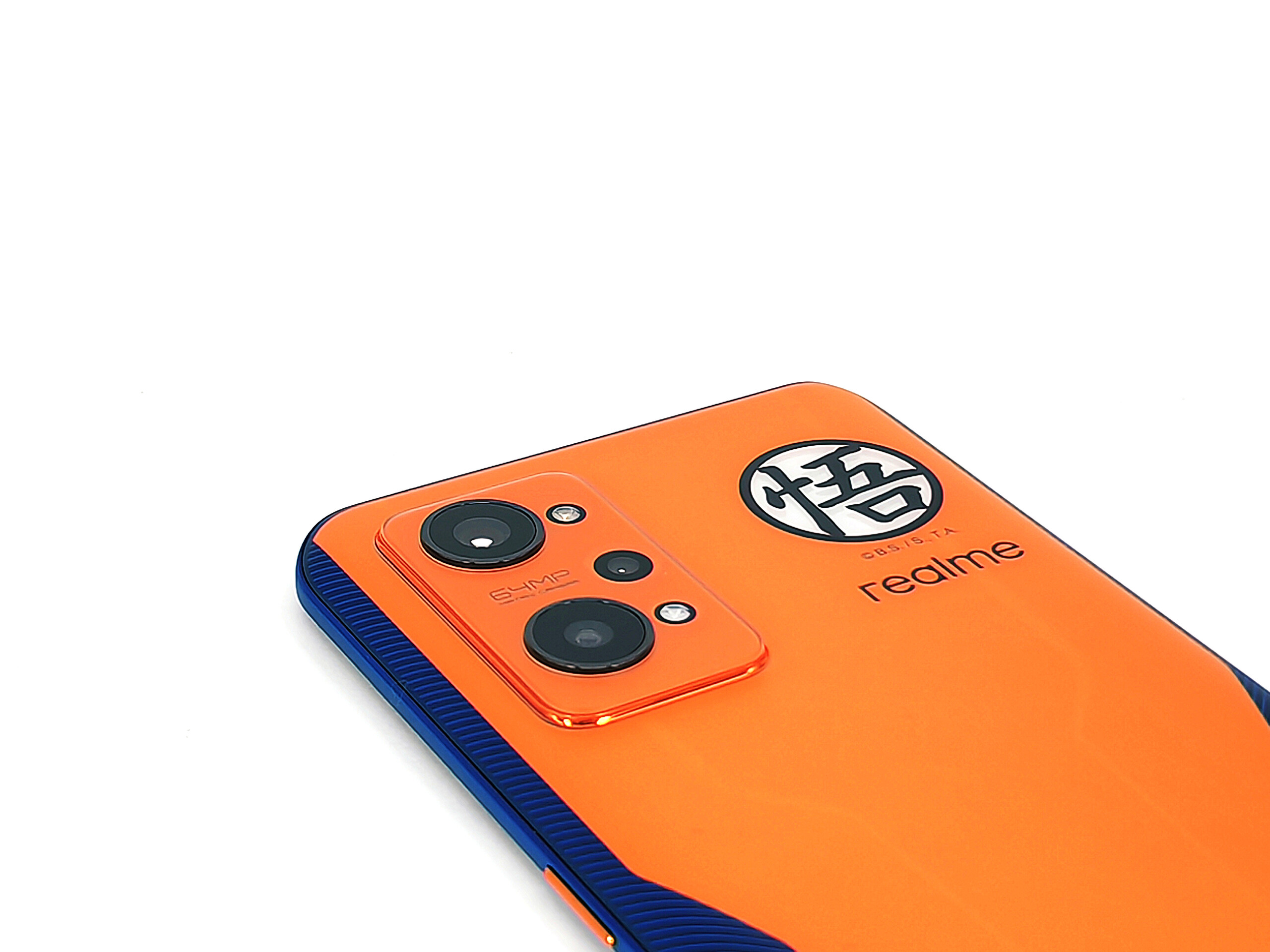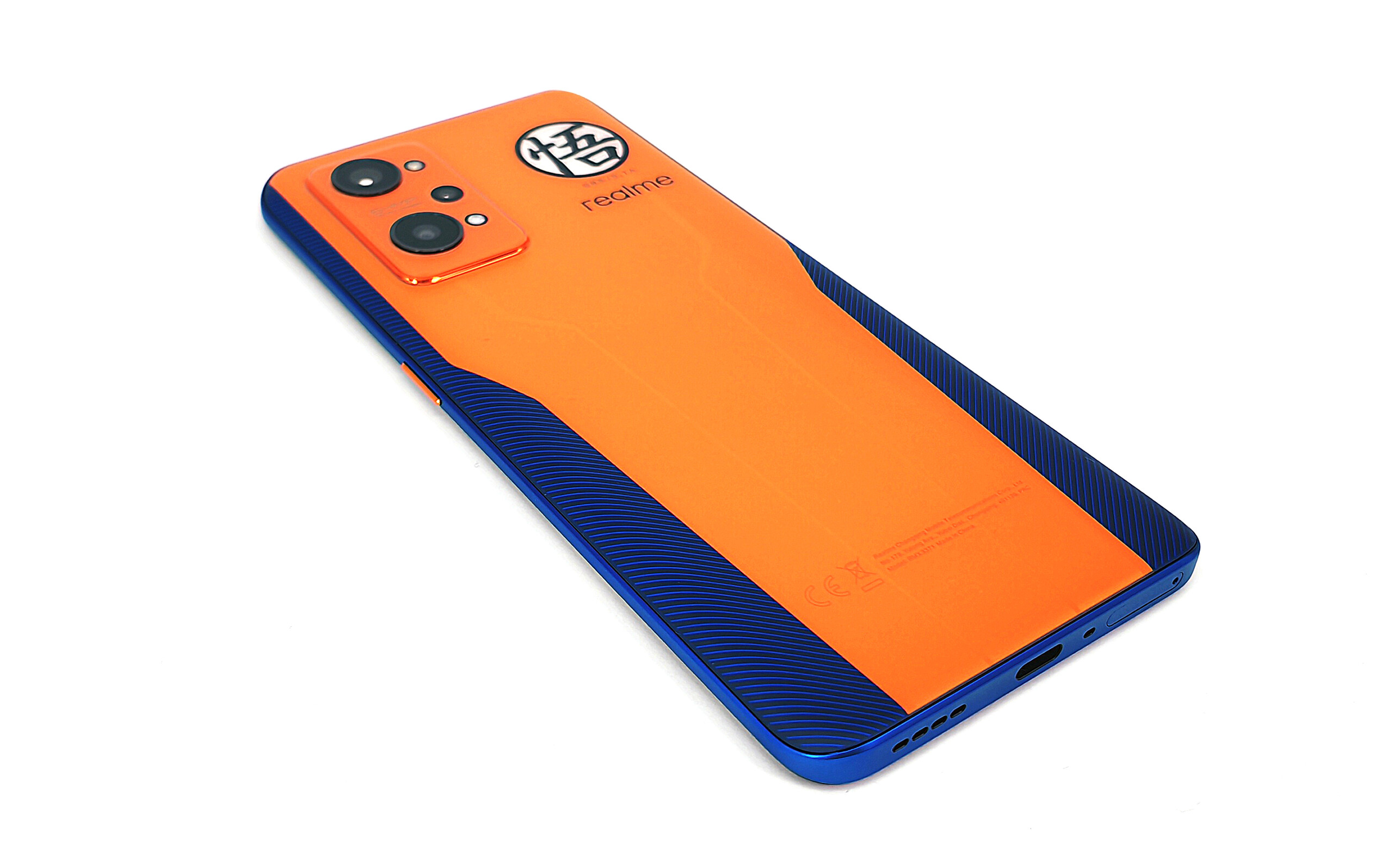 Como ya hemos dicho, no se aburre en cuanto a la selección de colores: Nuestra muestra de revisión es la edición "Dragon Ball Z", que solo se diferencia de la versión estándar del GT Neo 3T en detalles visuales: Una parte trasera naranja con un logotipo y los laterales azules dan al smartphone un aspecto único. El teléfono también tiene un diseño especial para la interfaz de usuario en estilo anime y una animación de carga especial.