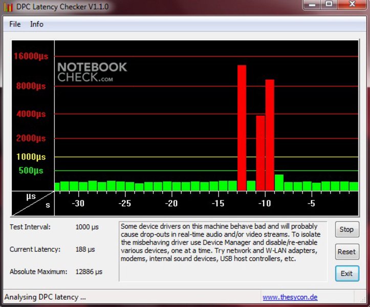 Finalmente miramos las latencias bajo Windows 7. EStas pueden ser probadas y leidas usando la herramienta "DPC Latency Checker". Si los valores de este test se situal por encima de 1000μs, puede ocurrir problemas con dispositivos periféricos, p.e. chasquidos en tarjetas de sonido externas. Durante nuestro test las latencias en ocasiones excedieron este valor. El valor máximo fue incluso superior a 10000μs. Con estos valores tan altos, serán comunes problemas con dispositivos periféricos.