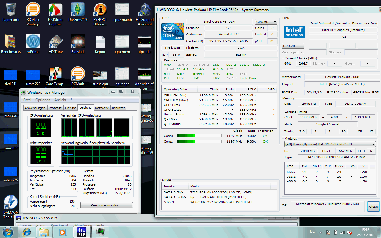 El rendimiento con aplicaciones es similar al de portatiles con i5-430M con GPUs de gama media (p.e. HP ProBook 6540b WD690E). sistemas con i7-720QM, dependiendo de la velocidad de sus discos duros, consiguen alrededor de 5,091 (Deviltech Fire DTX) o 6,225 puntos (MSI GX740-i7247LW7P). Por tanto hay que decir que el EliteBook 2540p funciona al nivel de un Core i7.