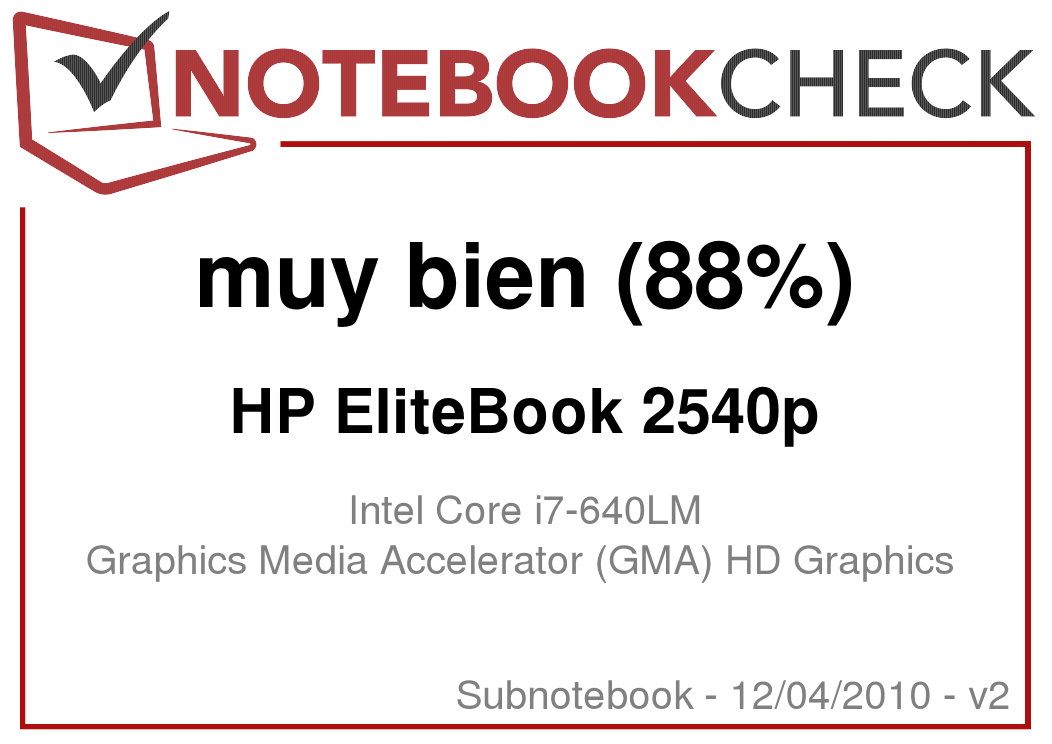 El HP EliteBook 2540p (versión WK302EA) consigue que lo puntuemos como "Muy Bueno", y mantiene la cabeza muy alta en la comiunidad de subportatiles. El Core i7-640LM de alto rendimiento (2 x 2.13 GHz, Turbo Boost, Hyper threading) es un digno sucesor de los procesadores Core 2 Duo de bajo rendimiento (la gama SL/SP) que fueron previamente los más potentes. A pesar de que está sometido un poco al lento disco duro de 1.8 pulgadas, el rendimiento del sistema se acerca al nivel de los potentes sistemas Core i7 (de voltaje normal).