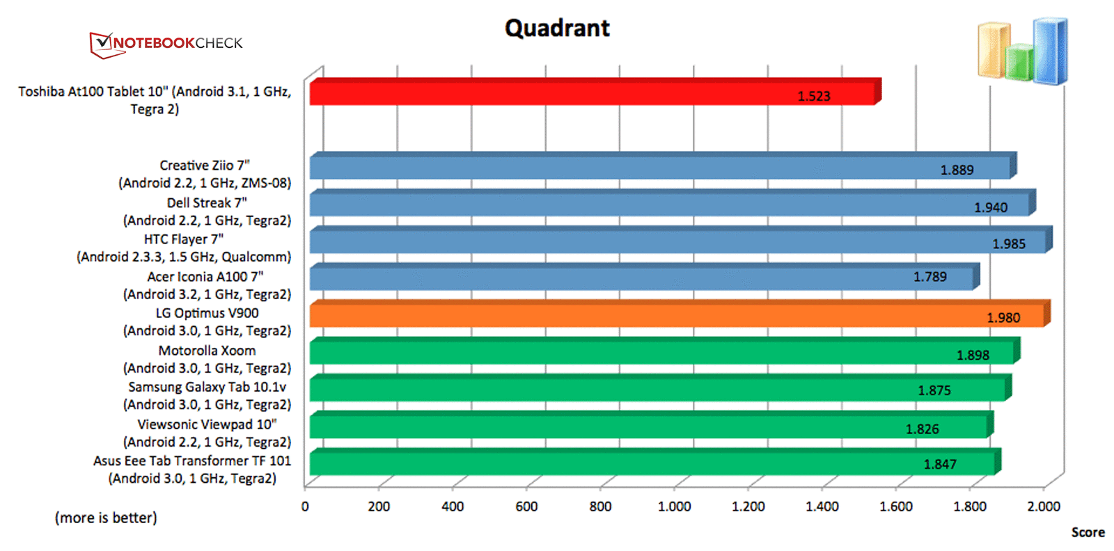 Cuando llegamos al banco de pruebas Quadrant, el Toshiba AT100 empieza a flaquear, cayendo hasta el último puesto con 1523 puntos. Este resultado no cambió después de varios intentos.
