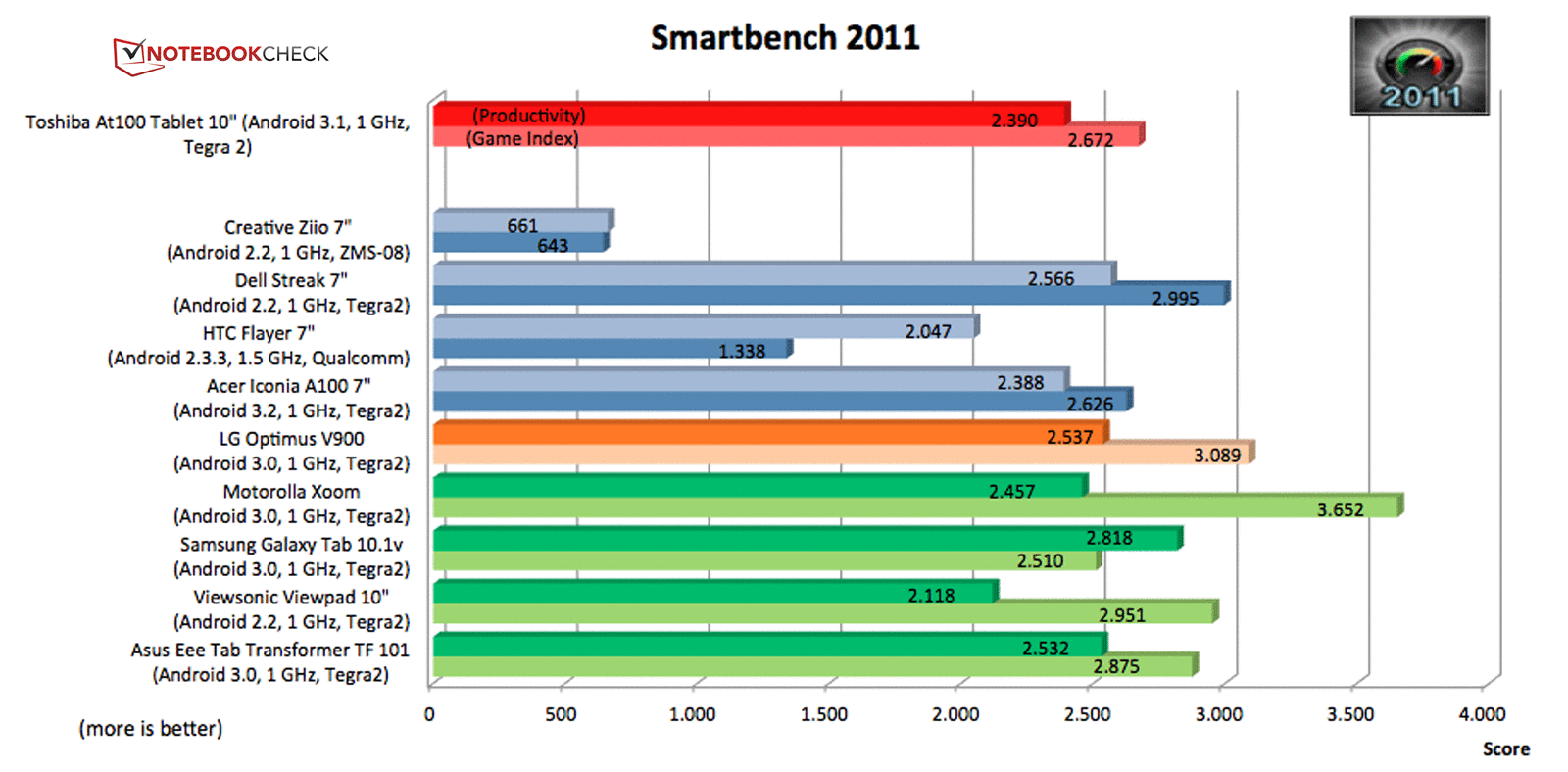 El tablet vuelve a recuperarse con el Smartbench; vuelve de nuevo a los primeros puestos con 2390 puntos en productividad y 2672 puntos en juegos.