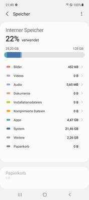 El Galaxy A72 tiene 6 GB de RAM y 128 GB de almacenamiento interno, de los cuales unos 100 GB están libres en la configuración de fábrica. Los usuarios que necesiten más espacio pueden almacenar archivos multimedia y datos de aplicaciones en la tarjeta micro-SD.
