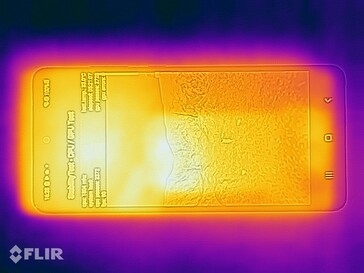La generación de calor del Galaxy A72 no es un problema, con un máximo de 34.7 °C. Sin embargo, el smartphone a veces tiene que estrangular su rendimiento internamente, como muestran los dos escenarios de prueba de GFXBench. El rendimiento cae significativamente justo después de la primera ejecución