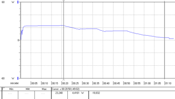 Al igual que con el modelo de 45W, conectamos el Anker 312 (Ace, 25W) al multímetro. El cargador consumió 24,37W de potencia hasta que el nivel de la batería alcanzó el 44% y después fue reduciendo gradualmente su potencia de salida. El adaptador Samsung empezó con 21W y fue subiendo poco a poco hasta los 23,26W. La marca del 41% se alcanzó tras 21 minutos, y entonces la potencia empezó a caer, pero a un ritmo algo más lento que en el cargador Anker.
