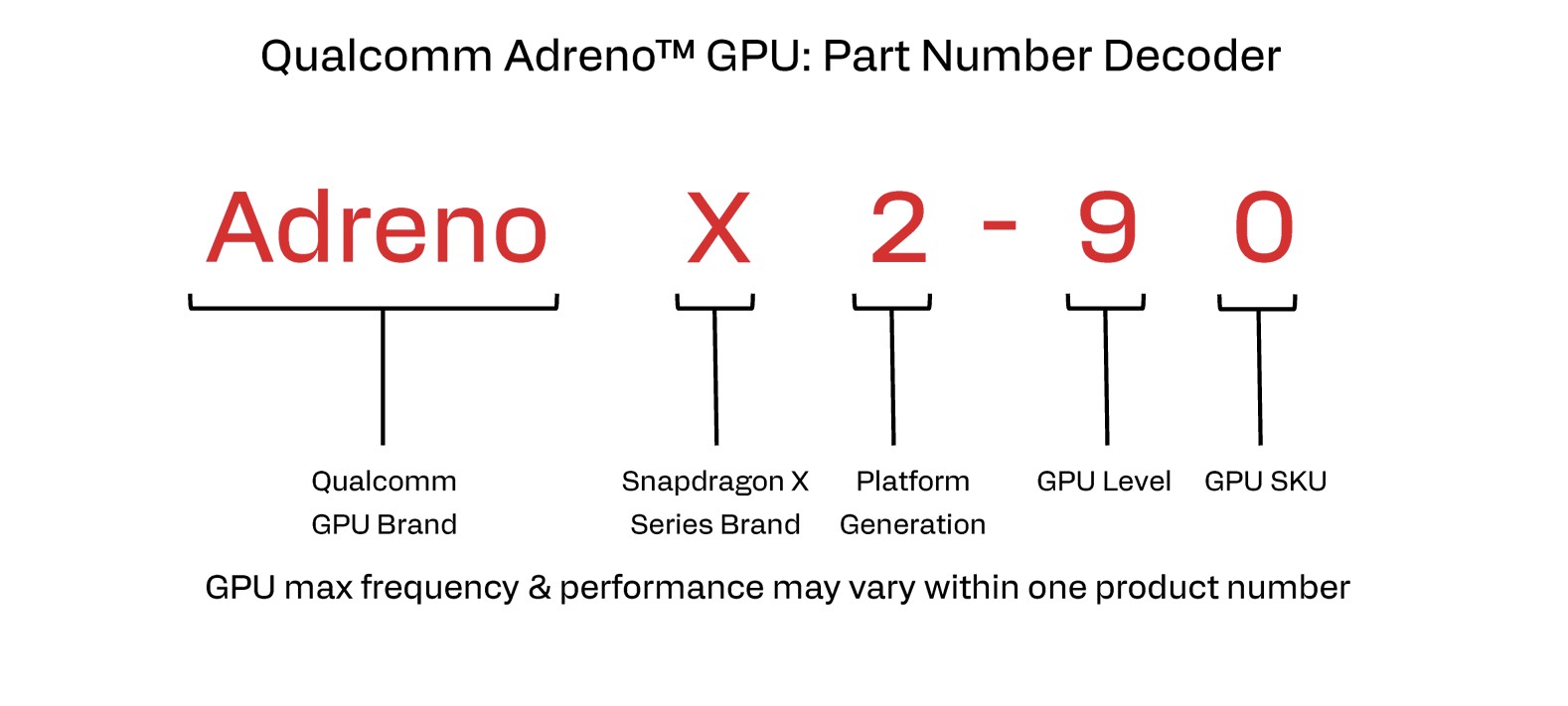 La nueva generación Snapdragon X2 comienza con las versiones más potentes y, además de los chips Snapdragon X2 Elite, también tenemos los procesadores X2 Elite Extreme. La nomenclatura ya era bastante confusa en la primera generación y ahora no es más fácil. Las dos imágenes siguientes muestran la nomenclatura tanto del procesador como del adaptador gráfico y su significado.