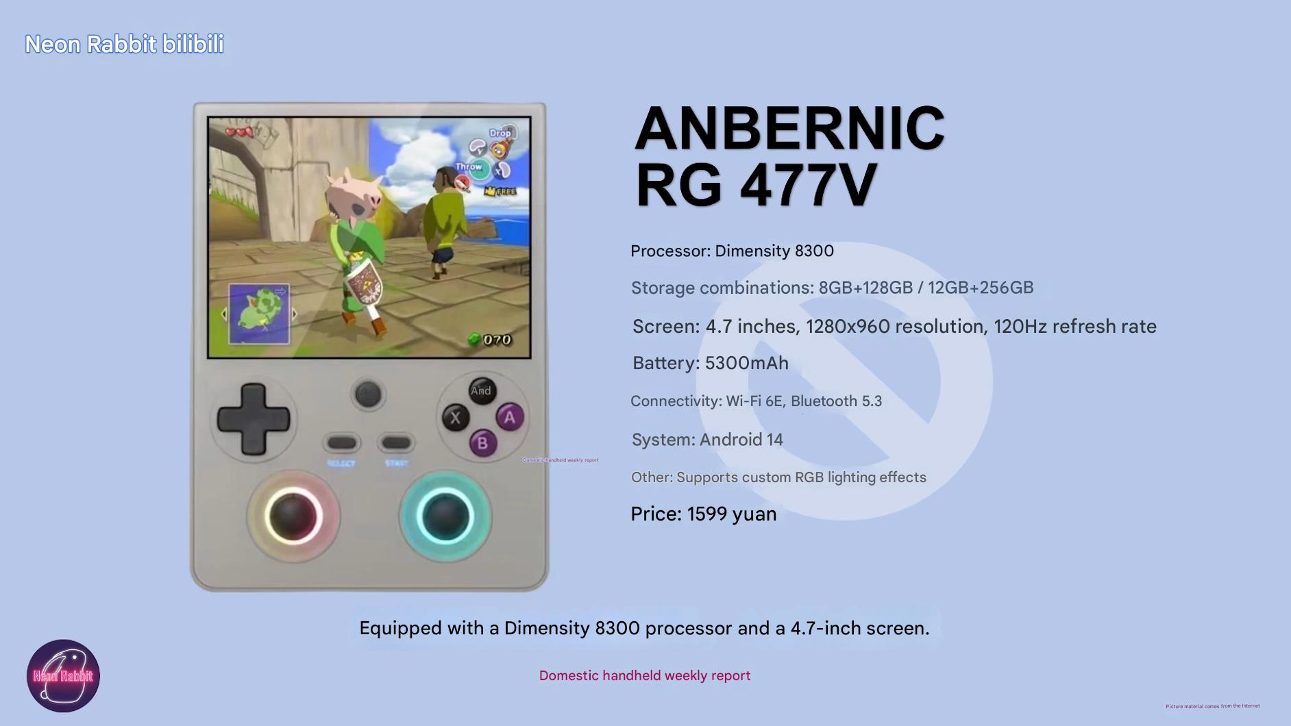 Según el filtrador Neon Rabbit, Anbernic está preparando ahora una nueva alternativa al ya existente RG406V. La cuenta, publicada en Bilibili, afirma que Anbernic ha creado el RG477V a partir de las tripas del actual RG477M. Como tal, se dice que el RG477V contiene un MediaTek Dimensity 8300 y una pantalla IPS de 4,7 pulgadas. Ambas mejoras con respecto al hardware que se encuentra en el RG406Vel RG477V pondrá su chipset considerablemente más rápido al servicio de una resolución de 960p y una frecuencia de refresco de 120 Hz que podría utilizarse para la Inserción de Marco Negro (BFI) para mejorar los efectos CRT.