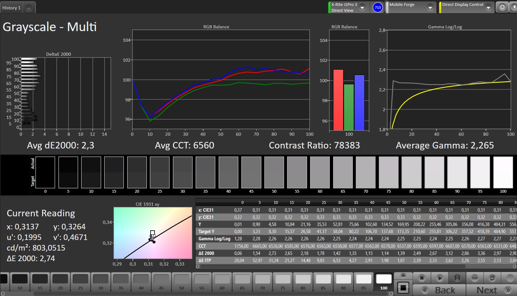 La calibración del color de la pantalla se evaluó utilizando el software de análisis Calman y un fotoespectrómetro, revelando sólo pequeñas desviaciones de los valores de referencia.