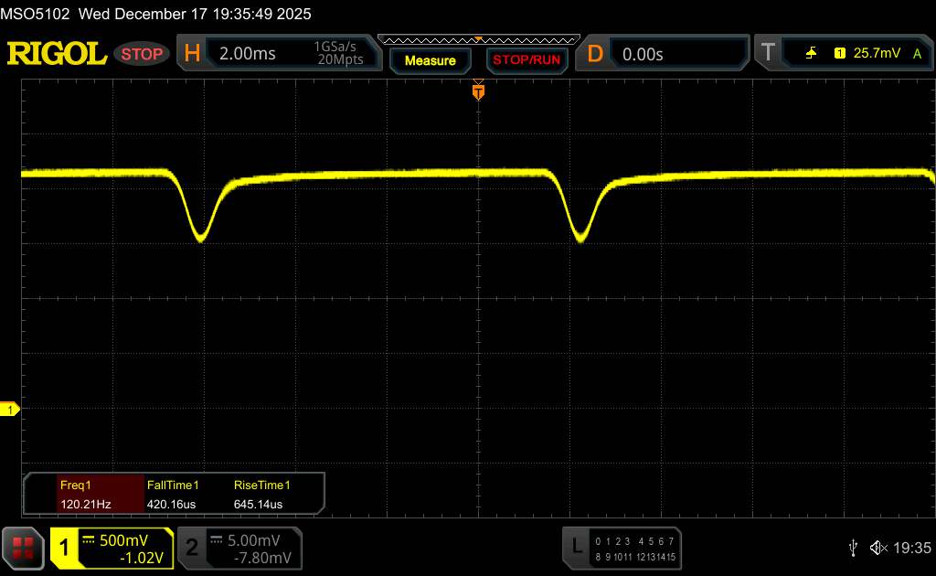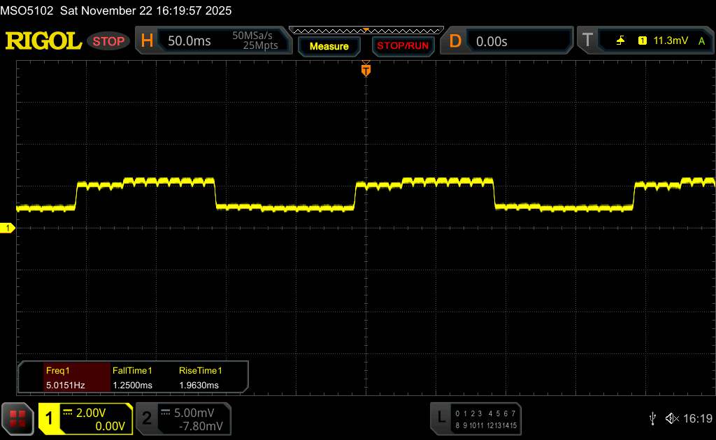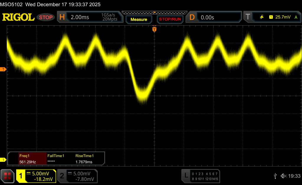 Al tratarse de un panel OLED, el brillo se controla mediante modulación por ancho de pulsos. Según el fabricante, el iQOO 15 utiliza atenuación PWM de alta frecuencia a 2.160 Hz para reducir posibles efectos negativos como el parpadeo visible. Nuestras mediciones con el software Rigol indican una frecuencia base de unos 560 Hz.