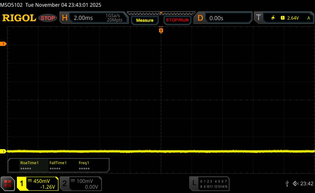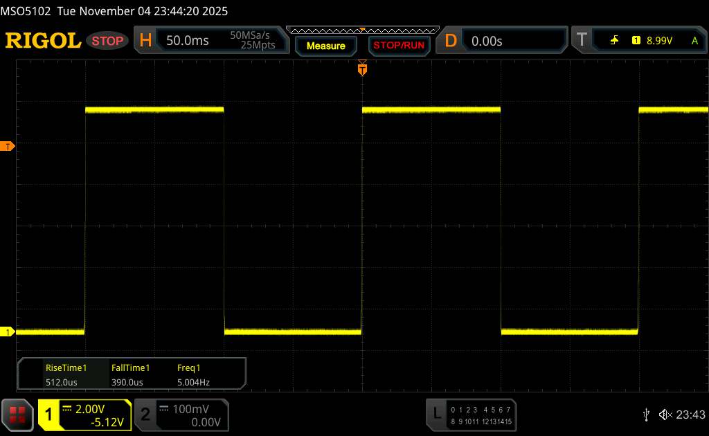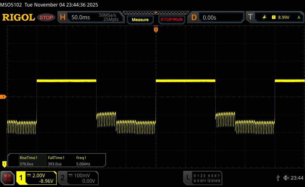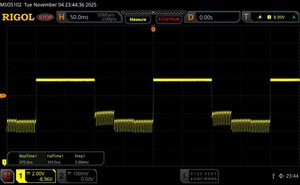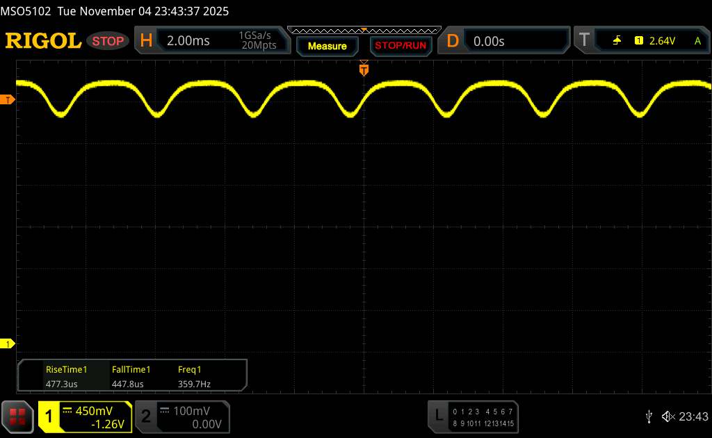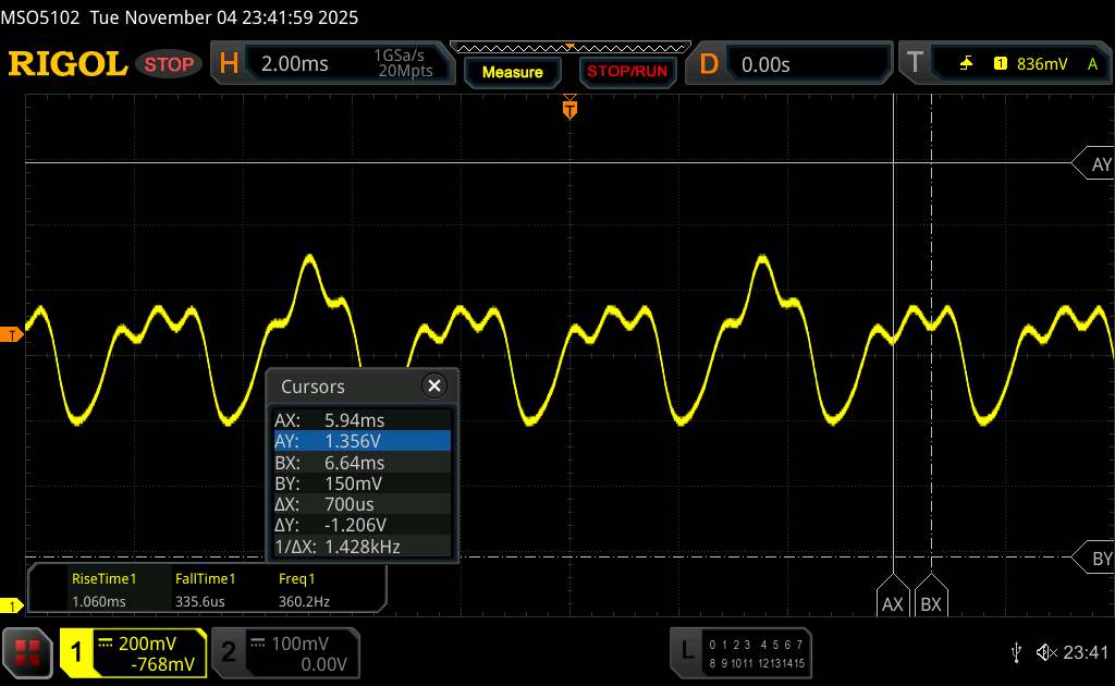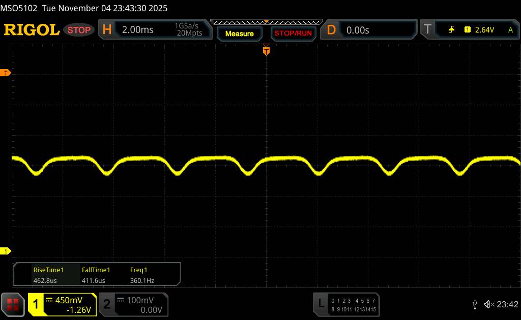El Pura 80 Pro utiliza la modulación por ancho de pulsos para controlar el brillo de la pantalla. Según el fabricante, dispone de atenuación PWM de alta frecuencia a 1.440 Hz, lo que minimiza los efectos relacionados con el parpadeo. Nosotros medimos una frecuencia muy similar a esa con el software de Rigol.