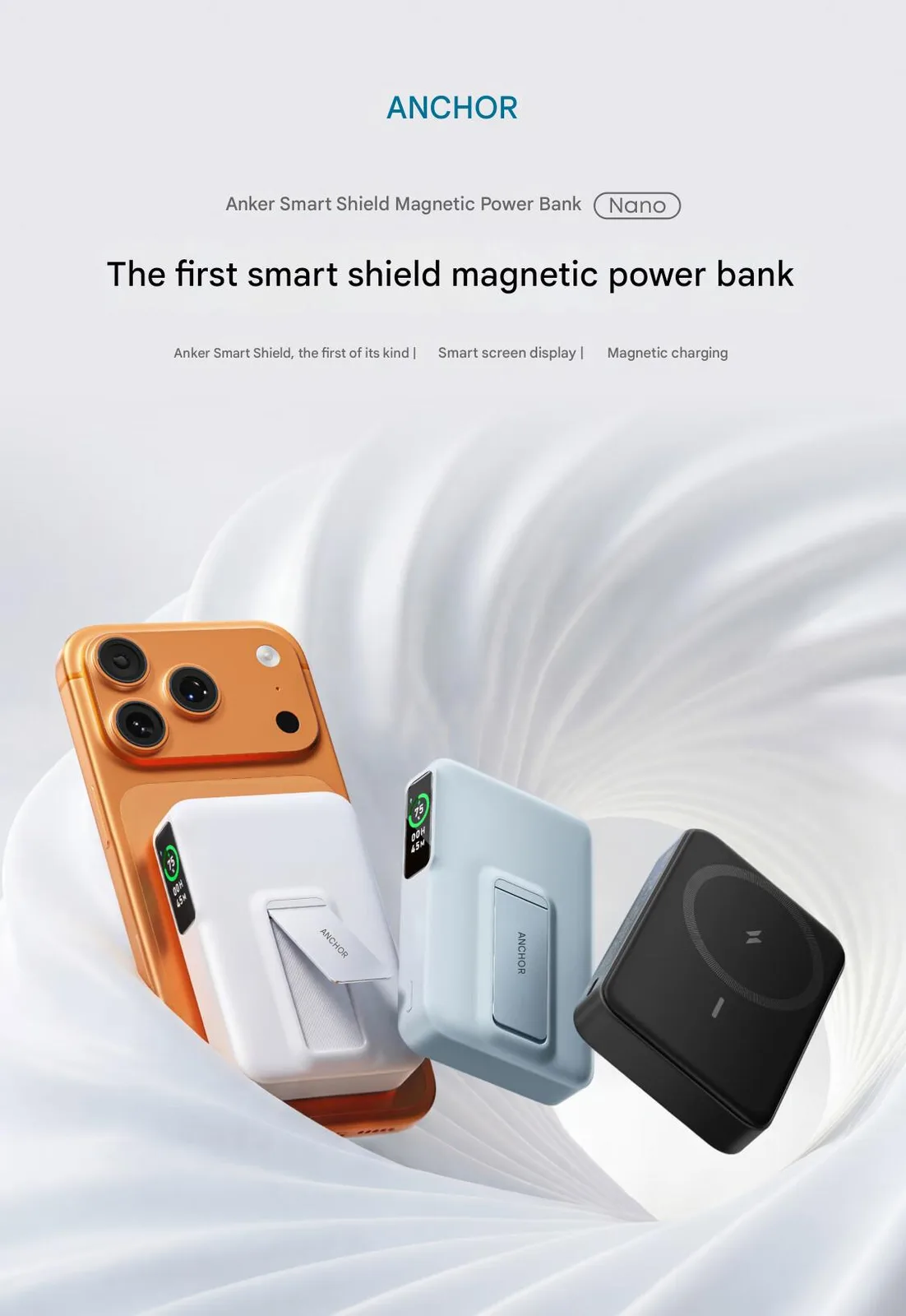 El Nano Smart Shield Magnetic Power Bank de Anker puede utilizarse para cargar un smartphone de forma inalámbrica, con una salida de hasta 7,5 W a través de la almohadilla de carga frontal. Puede cargar un dispositivo a una potencia de hasta 27 W a través del puerto USB-C, que también se utiliza para recargar la batería de 10.000 mAh del power bank. Según la empresa, este modelo está equipado con células ATL "certificadas porApple". Además, cuenta con un soporte integrado y una pantalla LCD que puede mostrar los datos de carga, incluidos el tiempo de carga y la batería restante. El banco de energía portátil mide 107 x 68,9 x 21,9 mm, pesa 233 g y está disponible en tres colores: negro, blanco y azul.