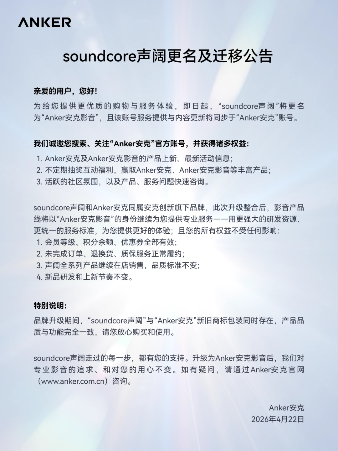 Anker añade que mientras realiza la transición al nuevo nombre de marca, los productos que lleven tanto Soundcore como Anker estarán disponibles en el mercado, por lo que los compradores no deben preocuparse por un cambio en la calidad o una diferencia en la función, ya que ambos productos son iguales.