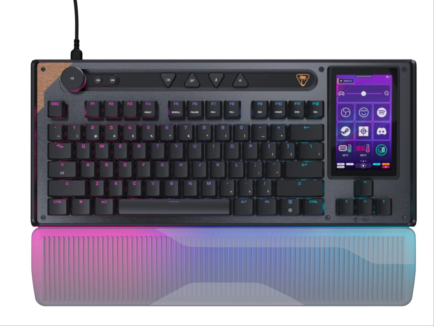 Empezando por el Command KB7 TKL, se trata de un teclado con cable con interruptores de efecto Hall de accionamiento ajustable y Rapid Trigger. Lo más interesante, una pantalla táctil de 4,3 pulgadas llamada Command Touch Display que lleva incorporados controles OBS y funciones Streamlabs, lo que hace que el streaming sea más fluido. Pero ofrece muchas más funciones, por lo que los usuarios que no hacen streaming también pueden aprovecharla al máximo. Puede permitirle activar macros, cambiar de perfil, ajustar el audio, iniciar aplicaciones y supervisar las estadísticas del sistema.