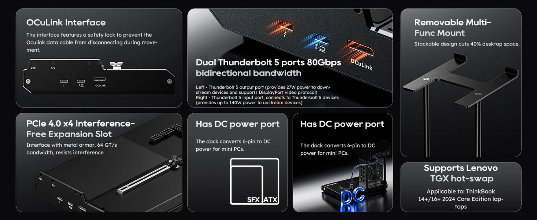 A primera vista, el Aoostar EG02 es la viva imagen del EG01. Por un lado, el primero conserva el sistema de montaje y el conector de alimentación de CC del segundo. Asimismo, conserva el factor de forma introducido por la Minisforo DEG1 y el Link S-1 de Peladn o el Link S-2. Sin embargo, el Aoostar EG02 adopta la conectividad OCuLink y Thunderbolt 5 aunque al igual que el Minisforum DEG2 y Peladn Link S-3 anteriores.