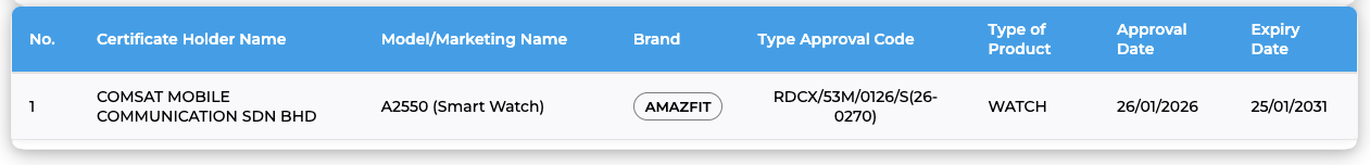 Ahora, una entrada en la base de datos del Standard and Industrial Research Institute of Malaysia (SIRIM) sugiere que se acerca el lanzamiento de otro reloj inteligente Amazfit. Denominado modelo A2550 (Smart Watch), ha sido registrado por Comsat Mobile Communications Sdn Bhd; esta empresa es propietaria de la marca Amazfit. Aparte de señalar que el dispositivo obtuvo la certificación pertinente el 26 de enero, no hay más detalles sobre el producto.