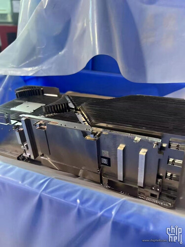 Mirando las imágenes proporcionadas en los foros chinos, es fácil ver cómo toda la idea de la Titan se estaba yendo de las manos. El póster de ChipHell muestra incluso marcos envueltos en forma de X, junto con una foto de perfil de la enorme cubierta oscura. Una última imagen revela que debajo de la cubierta se esconde un enorme sistema de refrigeración de 900 W con aletas de disipación a juego con los marcos en forma de X, además de placas y soportes adicionales en la parte inferior que refuerzan todo el conjunto y posiblemente ayudan a fijar la tarjeta en la placa base.