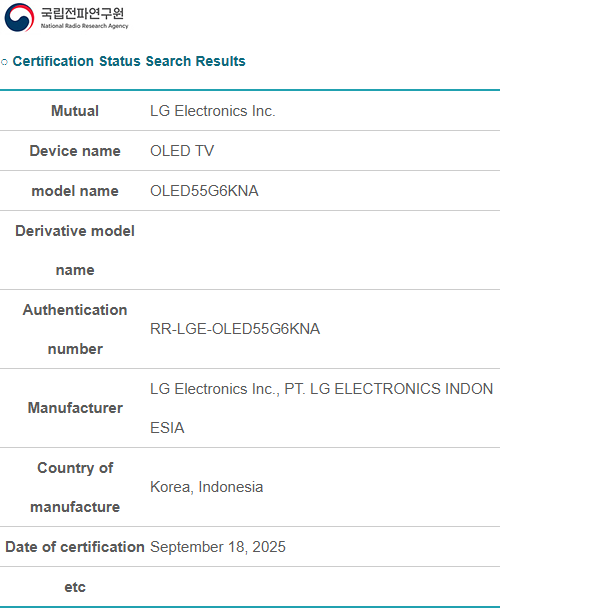 Recientemente, DisplaySpecifications descubrió los televisores LG C6 y G6 en la base de datos de la Agencia Nacional de Investigación Radiofónica (NRRA) en Corea del Sur. En ella, el tamaño de 55 pulgadas de cada uno figura como certificado para su venta en este mercado. Se espera que estos modelos se ofrezcan en varios tamaños. Para contextualizar, el 2025 C5 está disponible en versiones de 42, 48, 55, 65, 77 y 83 pulgadas, mientras que el G5 puede adquirirse como televisor de 55, 65, 77, 83 o 97 pulgadas.
