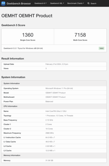 Cabría esperar que Geekbench reflejara la ventaja teórica de rendimiento del Core Ultra 5 135H. Sin embargo, los primeros resultados de los puntos de referencia están por todas partes y no muestran ninguna ventaja discernible para el Core Ultra 5 135H sobre el Core Ultra 5 135U. Dicho esto, recomendaríamos tomar los primeros resultados de pruebas comparativas como estos como indicaciones de cómo puede rendir un dispositivo de venta al público.