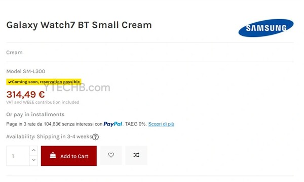 Posteriormente, YTECHB ha descubierto un minorista europeo que ofrece no sólo el Galaxy Watch7 de 40 mm, sino también su variante más grande de 44 mm y el Galaxy Watch Ultra. Como muestran las capturas de pantalla que figuran a continuación, el único minorista cree que el trío estará disponible por los siguientes precios en toda la zona euro: