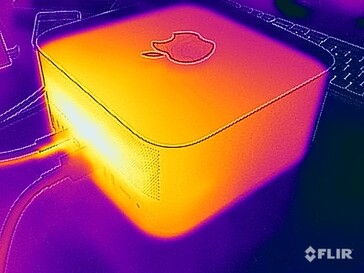 No hace falta decir que las temperaturas superficiales no son tan importantes para los ordenadores de sobremesa y las pantallas como lo son para los portátiles, pero también podemos dar el visto bueno aquí porque realmente no se calienta de todos modos. La parte superior del Mac Studio se calienta hasta unos 36 °C en la prueba de estrés, ya que el disipador de calor está justo debajo. Registramos alrededor de 40 °C (~104 °F) directamente en la salida del ventilador, lo que significa que todo está dentro de los límites de seguridad. El Studio Display también muestra un punto caliente en la parte trasera, pero 30 °C está absolutamente bien
