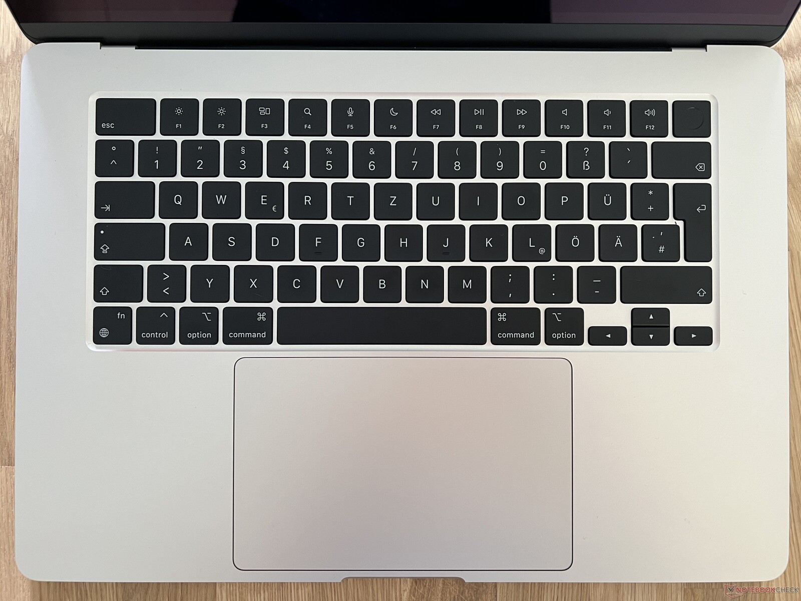 Los dispositivos de entrada también se han copiado sin cambios. El teclado negro está a buen nivel y las teclas de tijera normales también son agradables de teclear, pero sin duda hay teclados aún mejores, especialmente en el sector empresarial. La anchura adicional no se ha aprovechado ni para un teclado numérico ni para cubiertas de altavoz - sólo más superficie de carcasa. El escáner de huellas dactilares Touch ID sigue funcionando a la perfección. Apple lleva años siendo líder en iluminación blanca de teclados, ya que la intensidad se ajusta con gran precisión y se adapta automáticamente a la luz ambiente. En algunos portátiles Windows, el teclado también se activa mediante un sensor, pero normalmente sólo hay dos o máximo tres niveles con transiciones duras