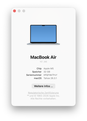 El diseño de la carcasa, incluidos los puertos, la cámara web y los dispositivos de entrada, no ha cambiado en comparación con el modelo M4 anteriorpor lo que sigue siendo un portátil muy delgado pero no especialmente ligero, con 1,512 kg. La calidad es excelente, tanto en términos de estabilidad como de calidad de construcción. Apple actualizó el módulo Wi-Fi y ahora es compatible con el último estándar Wi-Fi 7, incluido Bluetooth 6.0. Las velocidades de transferencia en nuestra prueba fueron buenas así como estables y también mejores en comparación con el más pequeño MacBook Air 13 M5. Las siguientes imágenes son de la anterior generación M4.