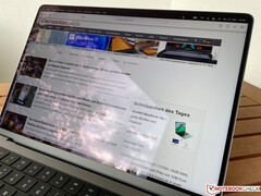En modo SDR normal, el brillo en el centro de la pantalla es exactamente de 500 cd/m², por lo que Apple lo ha calibrado muy bien. El nivel de negro del panel mini-LED es de sólo 0,02, lo que se traduce en un contraste extremadamente alto. En la práctica, la regulación automática del brillo y de la temperatura del color resulta muy práctica. La muesca sobre la pantalla sigue sin ser especialmente bonita, pero funcionalmente no hay más problemas aquí y el área de visualización junto a la muesca se superpone a la normal 16:10, por lo que tienes más espacio para los elementos del menú en comparación con otros paneles 16:10.