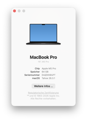 Apple ofrece un completo informe medioambiental https://www.apple.com/environment/pdf/products/notebooks/MacBook_Pro_M5_Pro_or_M5_Max_PER_Mar2026.pdf que incluye datos sobre las emisiones deCO2 así como los contenidos reciclados. La siguiente imagen muestra datos ejemplares para el modelo base del MacBook Pro 16 M5 Pro y el más alto mostrado M5-Pro-SKU con 48 GB de RAM y 1 TB de almacenamiento SSD tiene una huella de carbono de 284 kgCO2e.