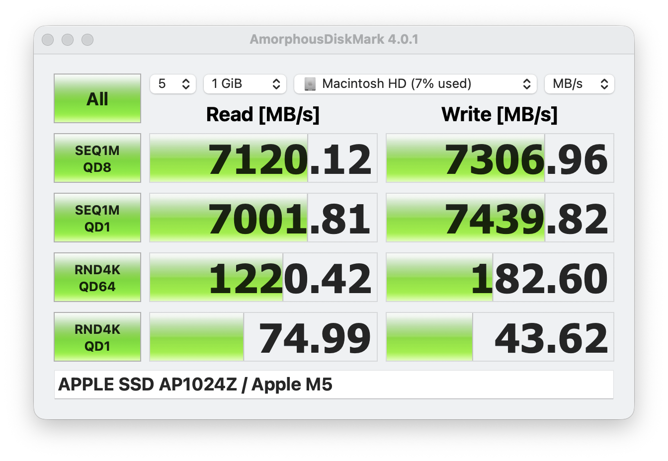 Apple ha vuelto a aumentar significativamente el rendimiento con su nuevo SoC M5, que actualmente es, con diferencia, el procesador mononúcleo más rápido disponible en el mercado. Las mejoras en su rendimiento multinúcleo y gráfico respecto al antiguo SoC M4 son ahora incluso mayores. Además, la velocidad de las unidades SSD se ha incrementado hasta niveles PCIe 4.0.