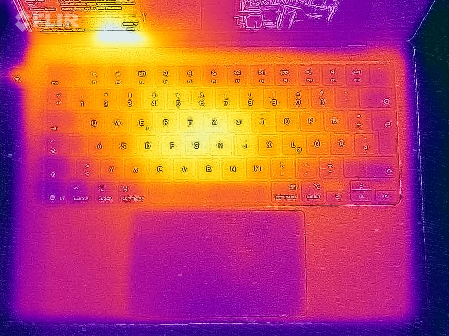 El consumo de energía en reposo del portátil se ha reducido ligeramente en comparación con su predecesor, y ~11 vatios es un buen valor teniendo en cuenta su alto brillo. Tampoco notamos sorpresas bajo carga. Probamos el MacBook con el adaptador de corriente de 70 vatios, que al final fue suficiente. Sin embargo, los compradores del nuevo MacBook Pro M5 deben tener en cuenta que Apple vende ahora el dispositivo sin adaptador de corriente; sólo se incluye un cable MagSafe en el volumen de suministro.