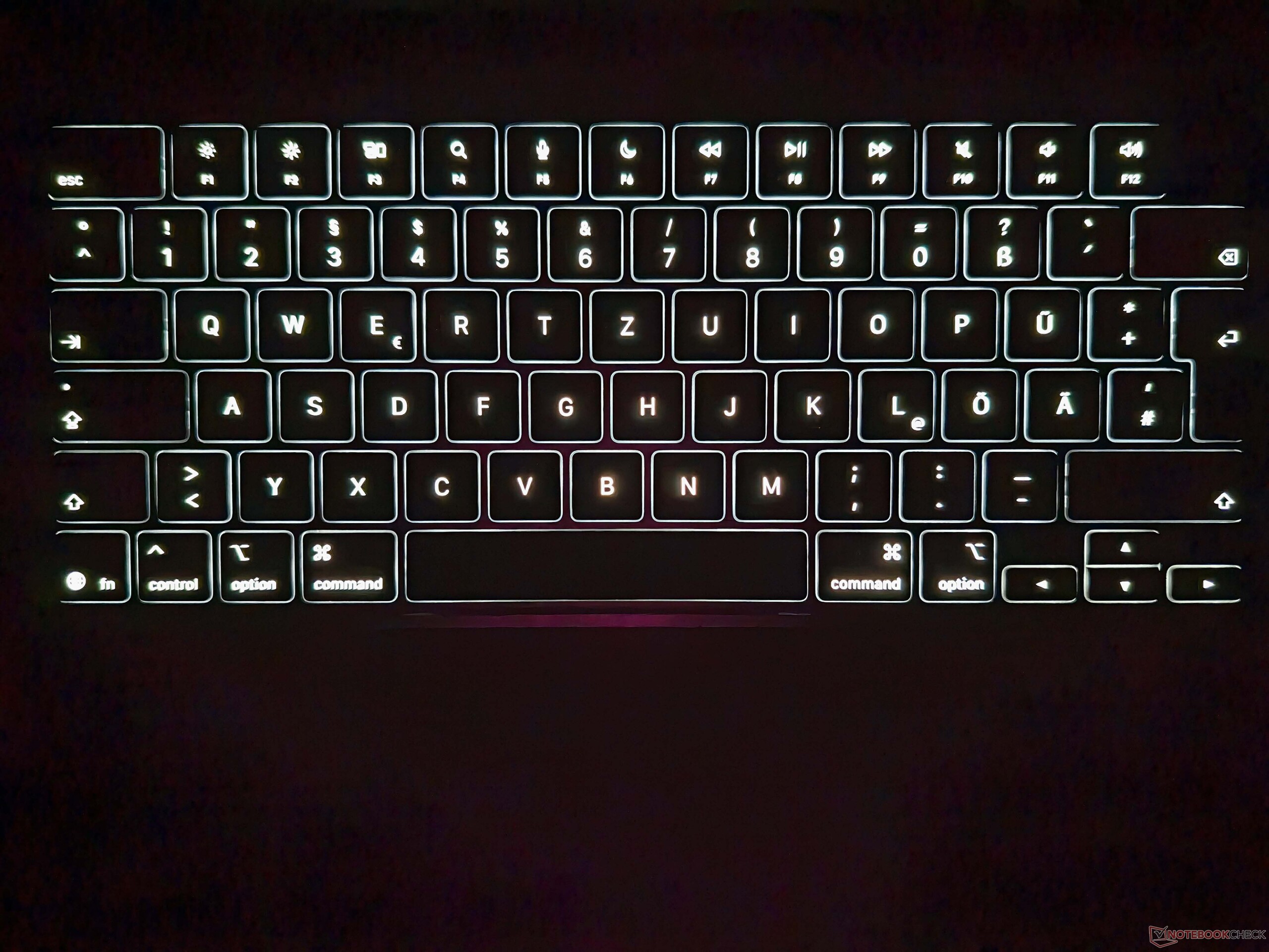 Apple sigue confiando en el conocido panel Mini LED. Los compradores también pueden elegir una versión mate (+150 $), de la que dispusimos durante nuestra prueba. Su calidad de imagen se resiente mínimamente como consecuencia de la superficie mate y los colores no son tan brillantes, pero a cambio, podrá trabajar en entornos luminosos sin tener que lidiar con molestos reflejos. La retroiluminación Mini LED parpadea constantemente a una frecuencia muy alta de algo menos de 15 kHz, por lo que no debería haber problemas para los usuarios sensibles. Por desgracia, debido a este parpadeo, no pudimos determinar con precisión los tiempos de respuesta de la pantalla, por lo que los resultados de nuestras mediciones sólo tienen una importancia limitada. Junto con su frecuencia de refresco de 120 Hz, no hay problemas de ningún tipo con el efecto fantasma visible.