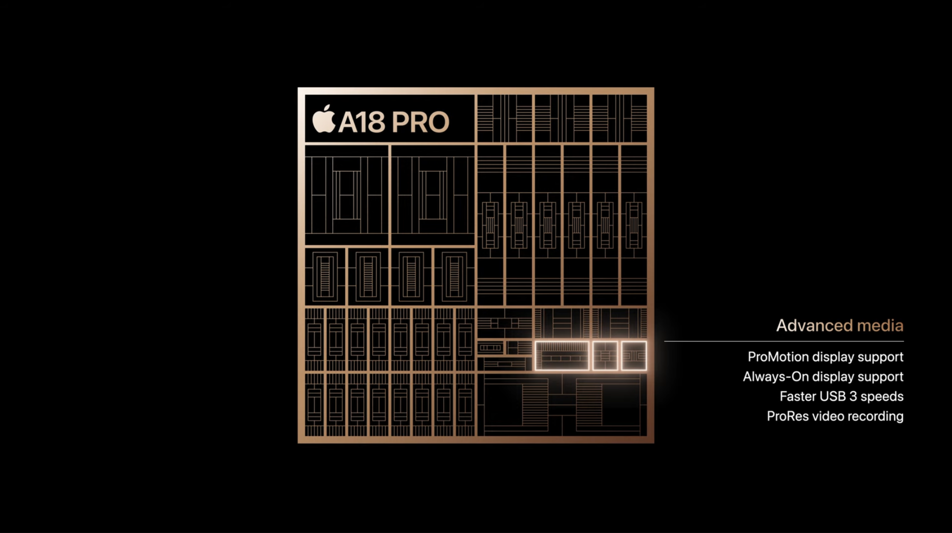 Apple afirma que el Apple A18 Pro ha sido fabricado a medida para adaptarse a los requisitos de los modelos "Pro" de iPhone. Como se predijo anteriormenteviene con una GPU de 6 núcleos, pero mantiene la misma disposición de la CPU. La empresa afirma que el A18 Pro es un 15% más rápido que el A17 Pro y consume un 20% menos de energía. Otras características notables incluyen un motor multimedia dedicado, velocidades USB "más rápidas" y grabación ProRes.