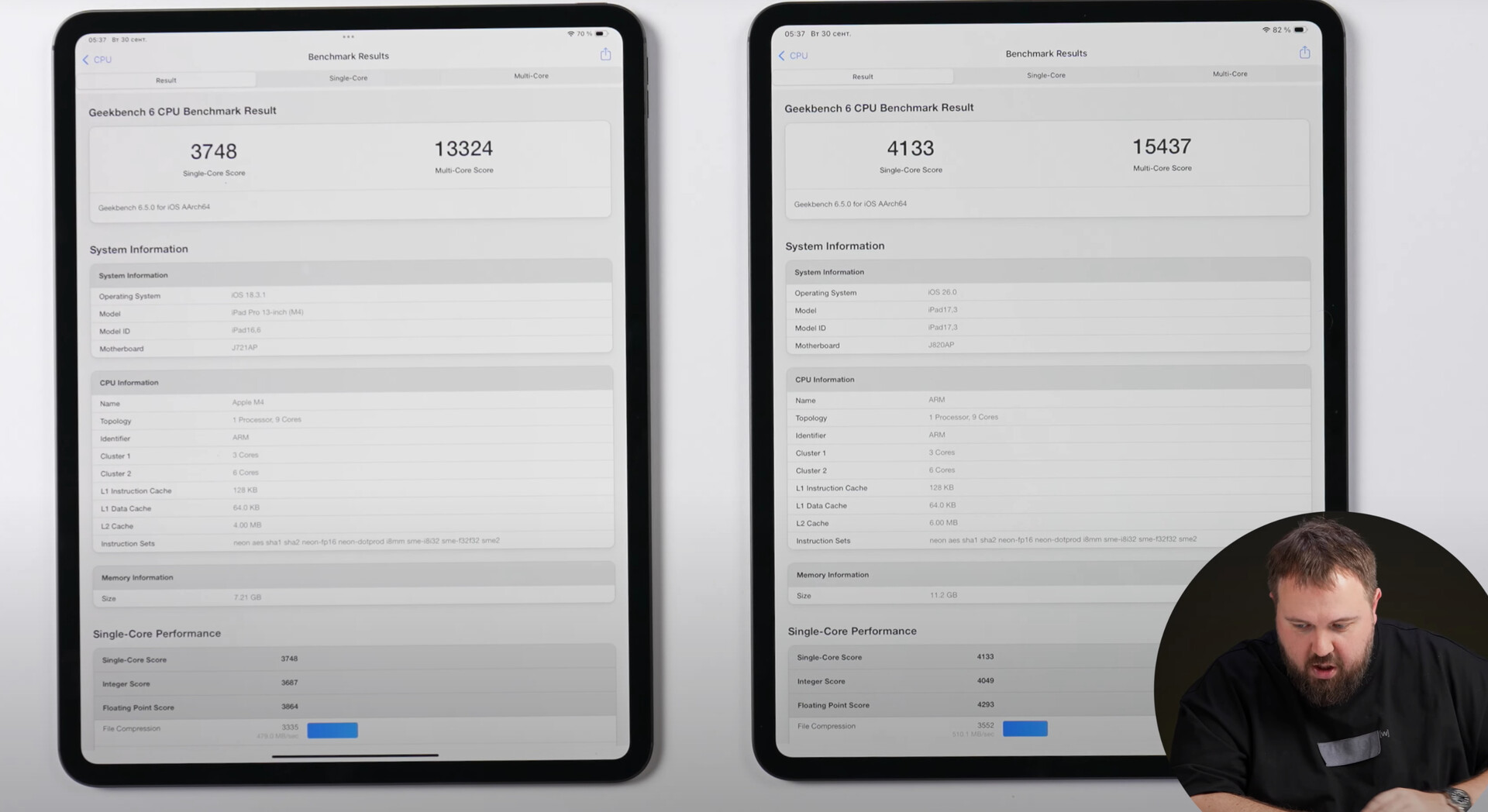 Aún así, el Apple M5 consigue en Geekbench 6 puntuaciones de un solo núcleo un 10% más rápidas y de varios núcleos un 16% más rápidas que el Apple M4 que lleva el iPad Pro del año pasado. Ayudado por un 50% más de caché L2, el Apple M5 también ayuda al próximo iPad Pro 13 a superar a su predecesor en aproximadamente un 8% en AnTuTu v10. Sorprendentemente, las puntuaciones en Geekbench 6 Metal saltan un 34% entre generaciones. Vea el vídeo de arriba y las imágenes de abajo para obtener más información. Se espera que Apple entregue su próximo iPad Pro 13 junto con su hermano menor de 11 pulgadas en las próximas semanas.