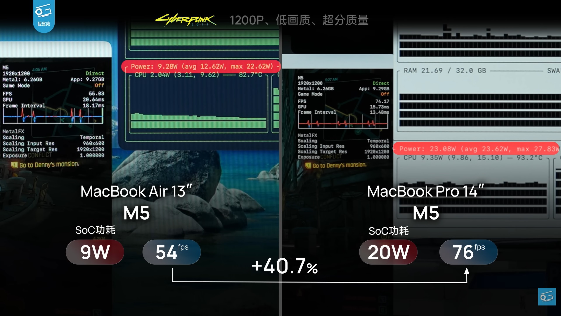 El crítico tecnológico coreano Geekerwan informa que, en Cyberpunk 2077 a 1200p/low con MetalFx upsampling, el MacBook Air 13 M5 sólo consumió 9 W y consiguió 54 FPS. Sin embargo, el MacBook Pro 14 M5 ejecutó el juego a 76 FPS mientras consumía 20 W. Esto supone una gigantesca diferencia de rendimiento del 40,7% entre los dos portátiles.
