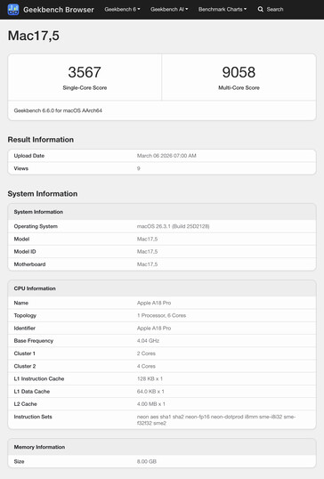 Del mismo modo, el rendimiento de la CPU multinúcleo indica que el MacBook Neo es marginalmente más potente que el MacBook Air M1. Por otro lado, la media de un solo núcleo de 3.530 es casi un 50% superior a la del mismo MacBook, que se sitúa en 2.363 puntos. Despacho, Apple M2-de los MacBook, el A18 Pro ayuda al MacBook Neo a puntuar alrededor de un 12,7% más que incluso el MacBook Pro 14 M3. De hecho, el MacBook Neo queda justo por detrás de los dispositivos de la generación Apple's M4 en cargas de trabajo de un solo núcleo. Consulte nuestro artículo sobre el lanzamiento del MacBook Neo para más detalles sobre Apple's $599 MacBook.