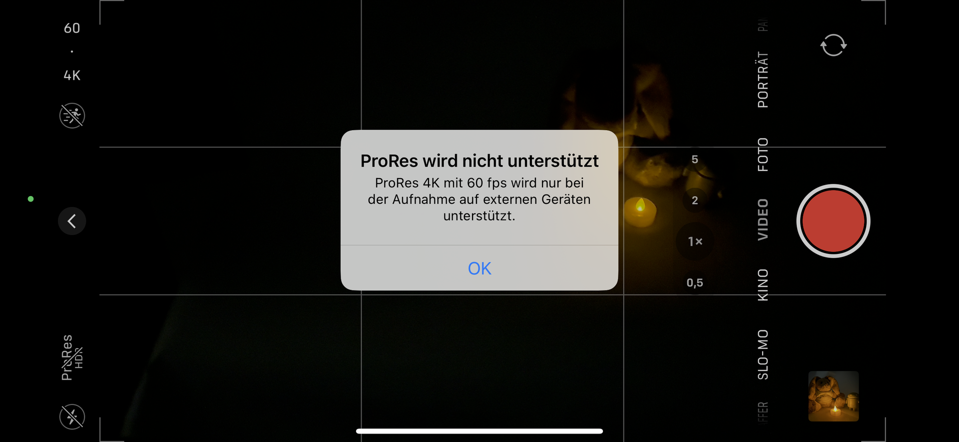 Pero lo mejor es la posibilidad de grabar vídeo en ProRes HDR 4k a 60 FPS. El almacenamiento de nuestro modelo de 256 GB (171,47 GB libres) ya estaba lleno después de 41 minutos cuando utilizamos este formato de grabación de almacenamiento intensivo en Full HD (60 FPS). Si queremos grabar en Ultra HD, el iPhone 15 Pro Max nos avisa para que conectemos un dispositivo de almacenamiento externo. Una memoria de 256 GB conectada debería entonces poder contener 34 minutos de material de vídeo. Es una pena que Apple sólo utilice el formato 16:9 para la grabación de vídeo. Para 21:9 y similares hay que recurrir a aplicaciones externas.