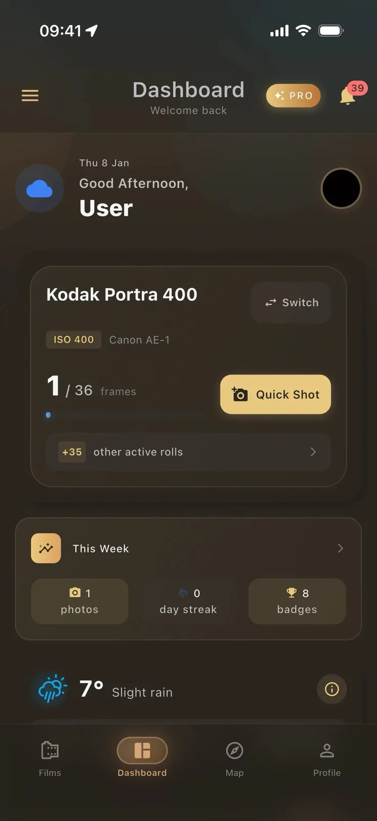 La app permite gestionar varios rollos de película al mismo tiempo. Por un lado, la app actúa como exposímetro al hacer fotos, facilitando la selección de la velocidad de obturación y la apertura correctas cuando se utiliza una cámara antigua sin medidor de luz integrado. Por otro lado, la app también permite añadir metadatos, incluyendo la fecha y la hora, así como información sobre el tiempo actual y las coordenadas GPS. Si lo desea, puede añadir una descripción