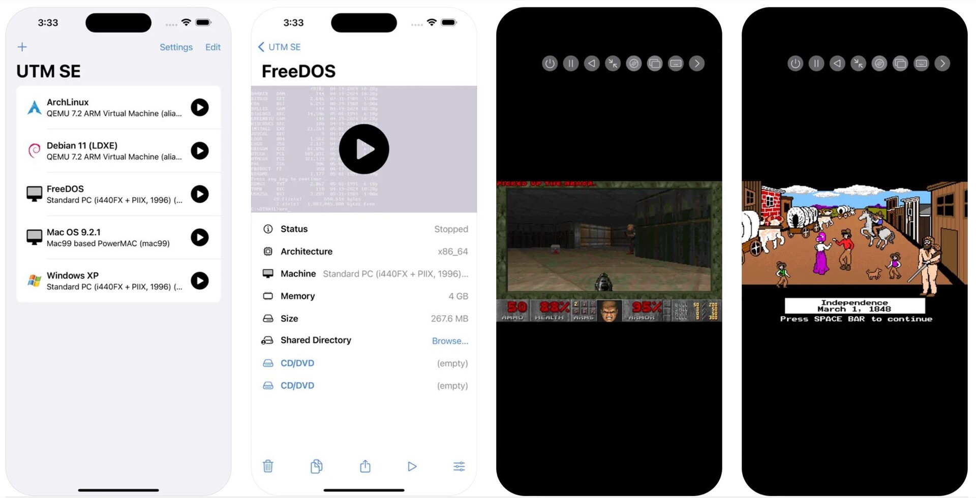 Con la ayuda de UTM y las herramientas proporcionadas en el sitio web del desarrollador, debería ser posible ejecutar sin problemas software antiguo de PC en un iPhone, incluidos juegos clásicos como Doom y juegos basados en texto. Los usuarios pueden almacenar varios sistemas operativos en UTM y alternar sin problemas entre ellos.