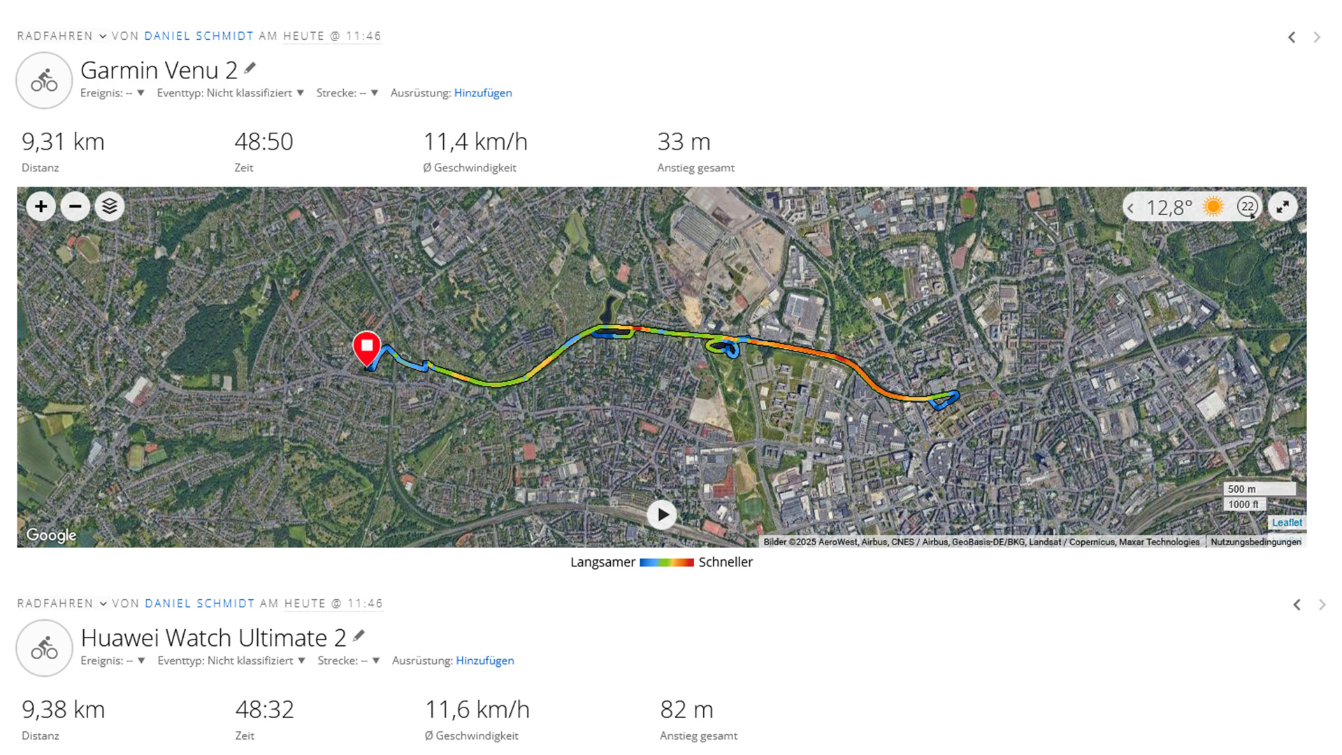 Para la frecuencia cardiaca, utilizamos como referencia una correa pectoral Polar H10. La desviación de la frecuencia cardiaca en reposo es de un latido por minuto, equivalente al 1,75 por ciento. También medimos la frecuencia cardiaca de rendimiento en tres momentos diferentes. En estas pruebas, la desviación media es del 0,96 por ciento, siendo la mayor desviación de dos latidos por minuto.