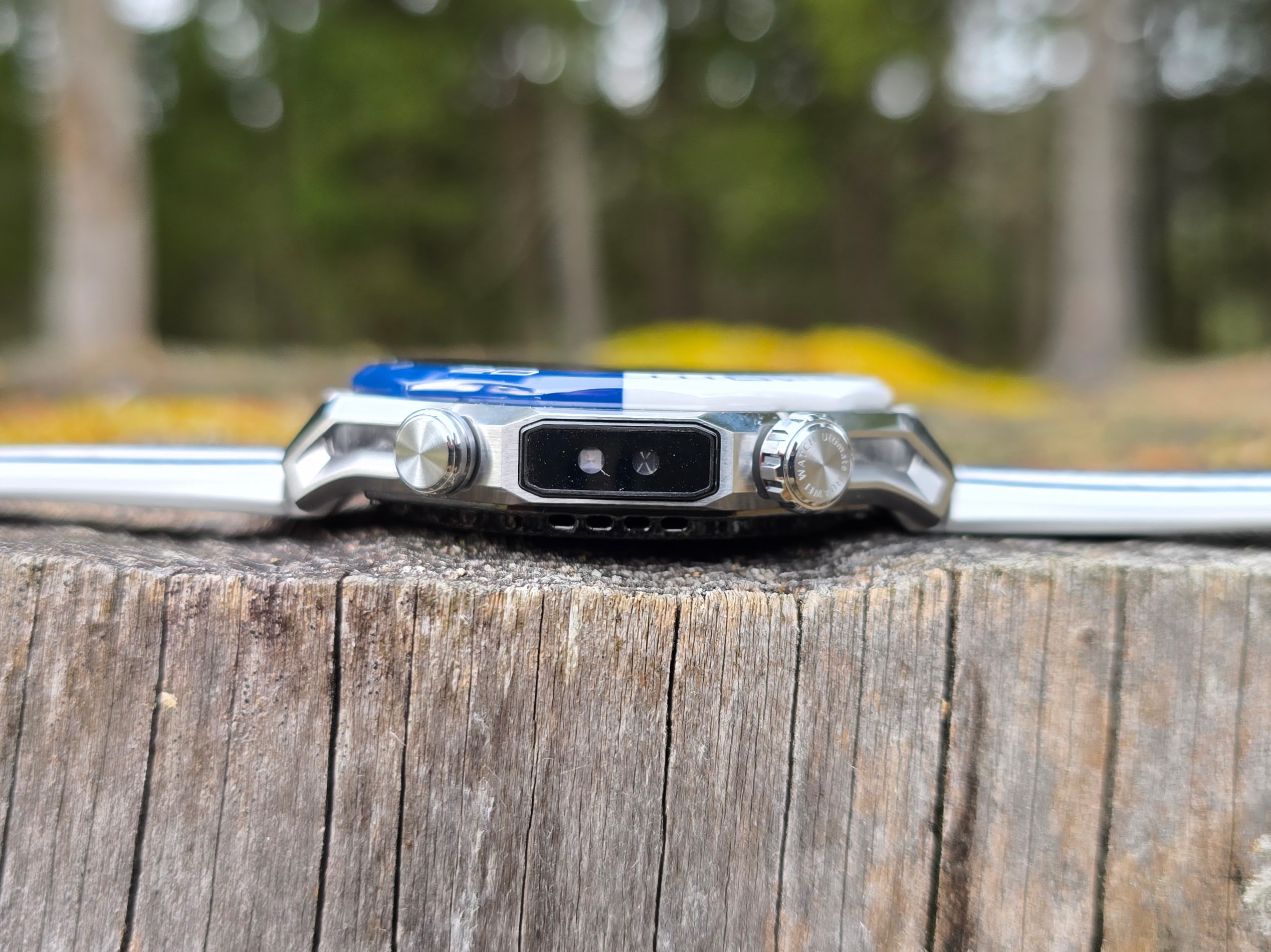 En el lado derecho, encontrará una corona giratoria y pulsable, un botón, un altavoz y el sensor X-Tap de Huawei. El lado izquierdo alberga otro botón y un sensor de profundidad. La correa de 22 milímetros se puede cambiar sin herramientas.