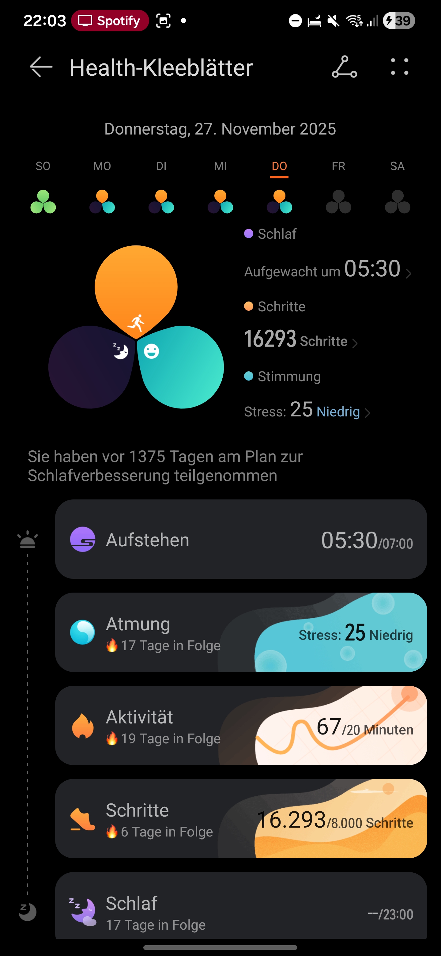 Huawei ofrece varios formatos visuales para los objetivos de actividad. Junto a los conocidos anillos, también hay un diseño en forma de hoja de trébol. Sus hojas se van rellenando a lo largo del día, con lo que el smartwatch realiza un seguimiento de los patrones diarios y establece objetivos como despertarse dentro de una franja horaria específica o mantenerse activo a lo largo del día.
