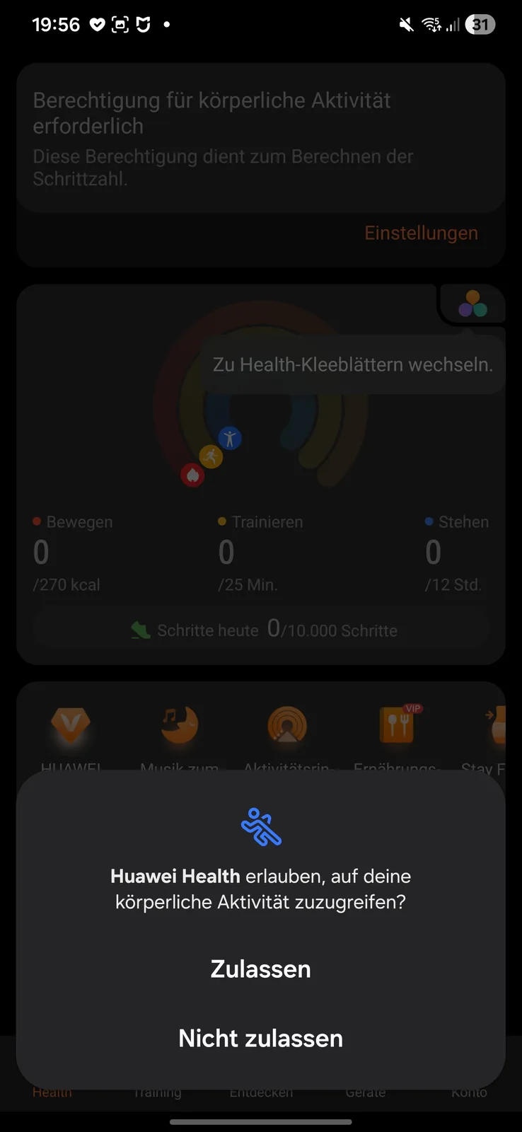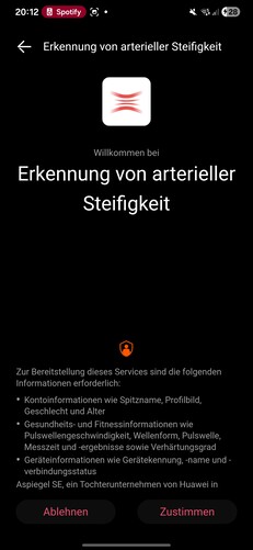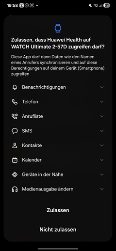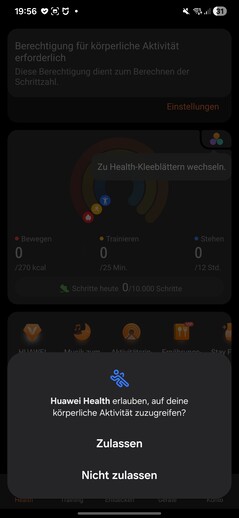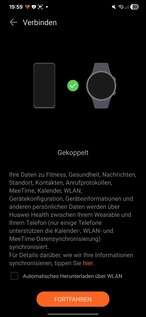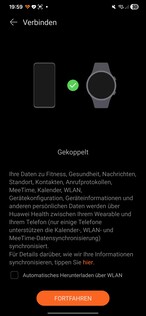 En las pruebas, el smartwatch se detectó inmediatamente y se emparejó sin problemas. Hay que conceder varios permisos durante la configuración. También se requiere un ID de Huawei. Al final del proceso, se inicia un tutorial en el reloj. Una cosa llama la atención: cada aplicación que se abre en el smartwatch requiere su propio consentimiento de procesamiento de datos por separado.