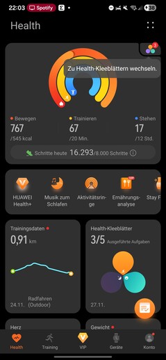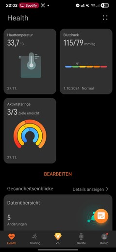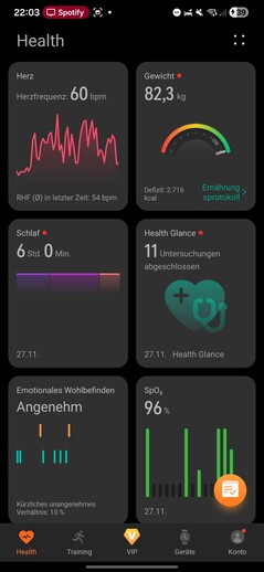 La app Salud está dividida en cinco secciones: Salud, Entrenamiento, VIP, Dispositivos y Cuenta. La pestaña Salud actúa como un panel de control de todos los datos biométricos registrados, que se muestran en forma de mosaicos personalizables.