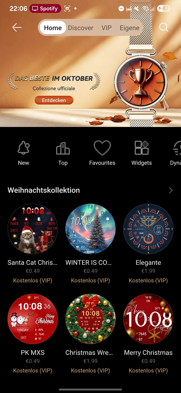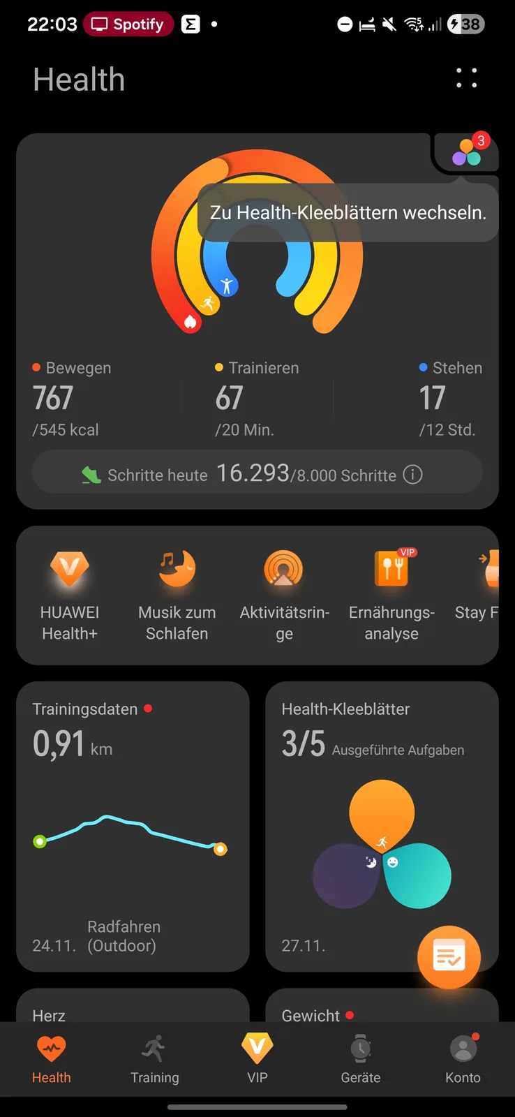 Los entrenamientos completados aparecen en Entrenamiento. VIP desbloquea el acceso al nivel Plus de pago. La pestaña Dispositivos contiene los ajustes, la AppGallery, la gestión de la música y una amplia selección de esferas de reloj.
