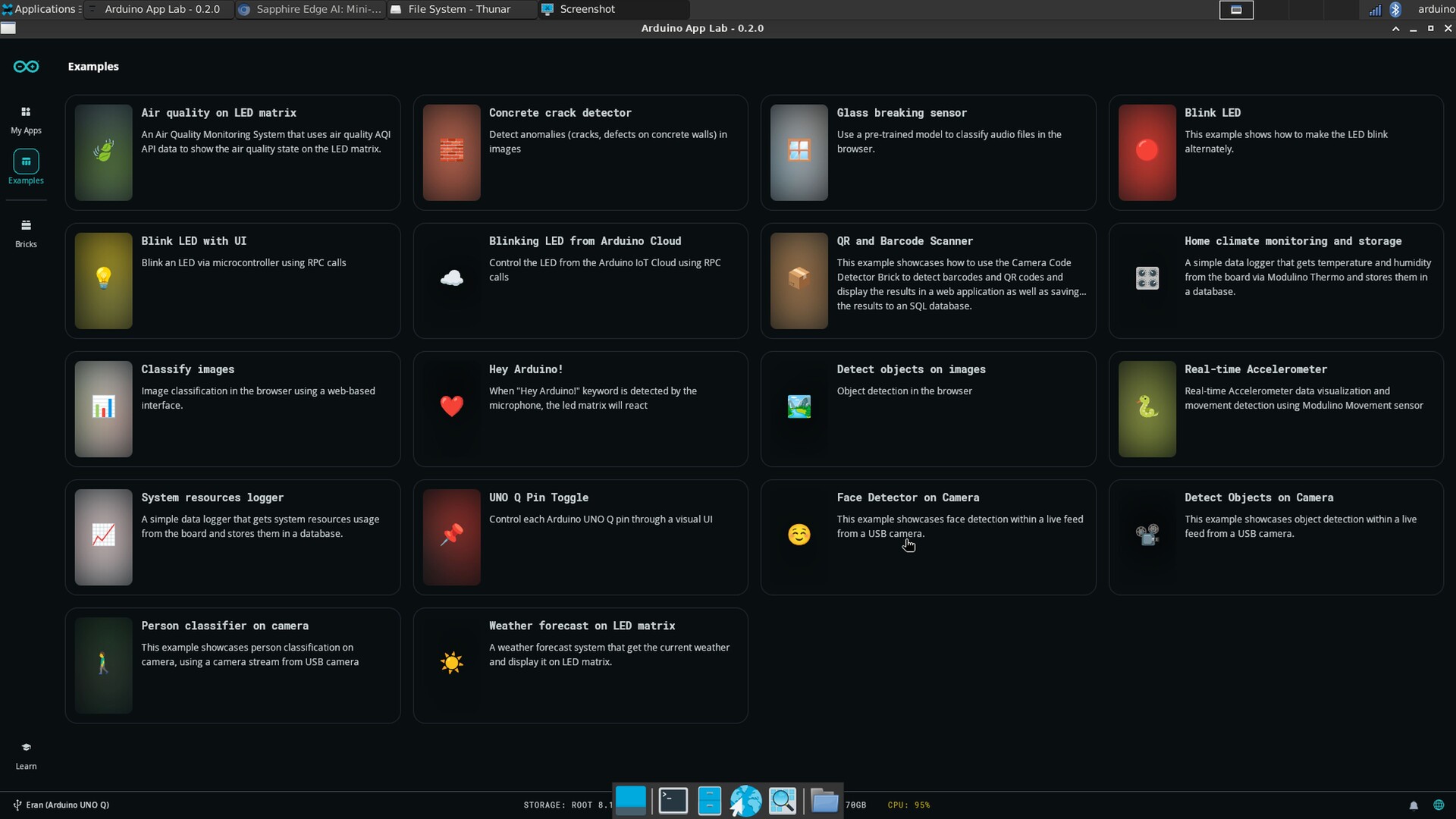 Arduino App Lab viene preinstalado y se actualiza a través de Wi-Fi tras la configuración inicial. Permite crear aplicaciones que aprovechan tanto el SoC Qualcomm como la MCU integrada. Los ejemplos incluidos lo ilustran bien: la placa ofrece una potencia de cálculo relativamente alta para una plataforma de desarrollador, lo que permite cargas de trabajo de IA locales. Se admiten modelos preentrenados para tareas como el reconocimiento de imágenes, lo que amplía las capacidades de una placa de desarrollador tradicional para incluir aplicaciones basadas en redes neuronales.