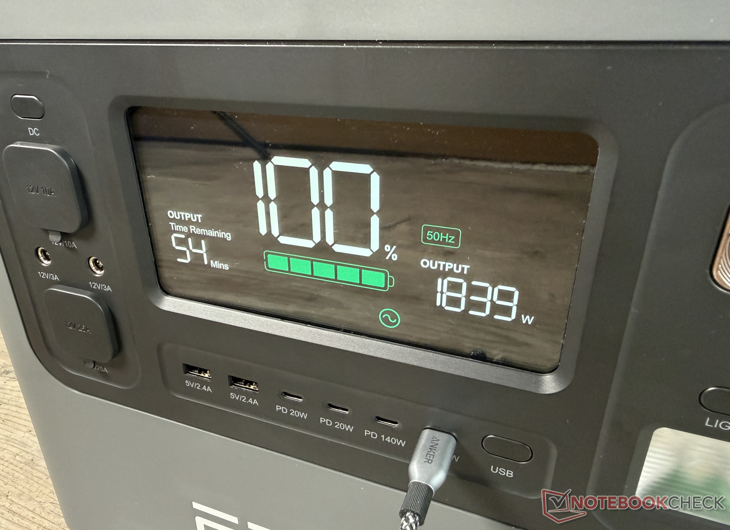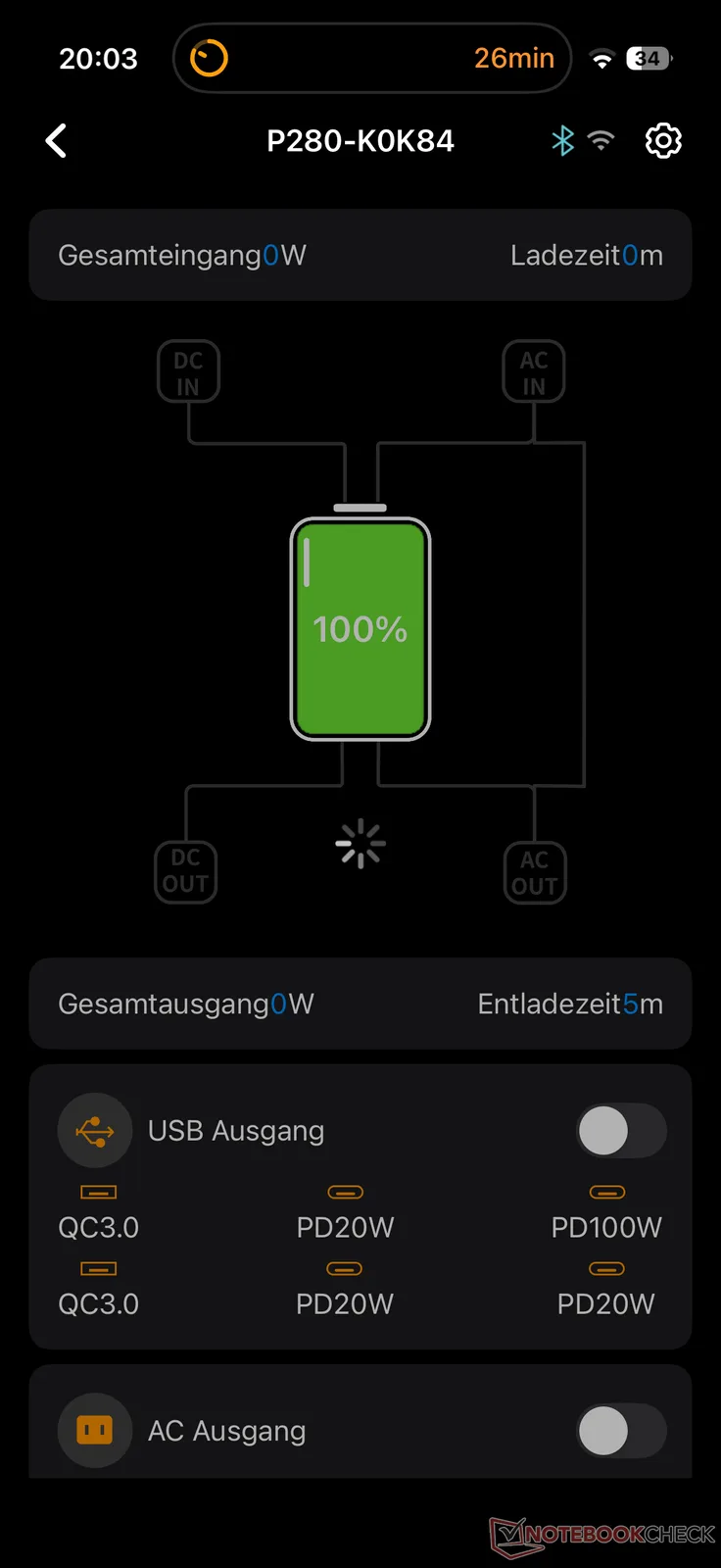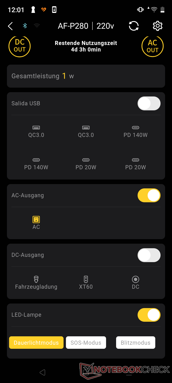 Durante la carga de CA, la Powerstation alcanzó los 1.800 W prometidos desde el principio y hasta un buen 60 por ciento. Tras unos 65 minutos, se había cargado el 80 por ciento y después de otros 50 minutos el proceso de carga había finalizado. El proceso de carga solar sólo pudo probarse de forma limitada debido a la falta de sol en el actual invierno en Hamburgo. Con la carga y descarga en corriente continua (corriente continua), la eficiencia suele ser mayor, ya que no hay pérdidas de conversión a corriente alterna.